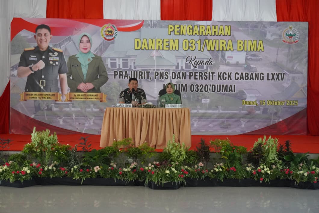 DUMAI || ‎Komandan Korem 031/Wira Bima, Brigjen TNI Jarot Suprihanto, melaksanakan kunjungan kerja ke Kodim 0320/Dumai dalam rangka memberikan pengarahan kepada prajurit dan PNS jajaran Kodim. Dalam kegiatan ini, Danrem turut didampingi oleh Ketua Persit Kartika Chandra Kirana Koorcab Rem 031 PD I/Bukit Barisan, Ny. Jarot Suprihanto, beserta pengurus,Rabu 15/10/25.