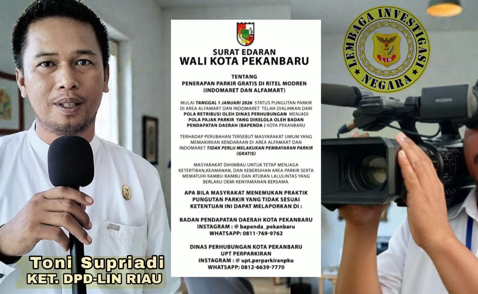 28 Desember 2025 – Ketua Lembaga Investigasi Negara (LIN) DPD Provinsi Riau, Toni Supriadi, memberikan tanggapan kritis terkait beredarnya kebijakan Pemerintah Kota Pekanbaru mengenai penggratisan biaya parkir di ritel modern seperti Indomaret dan Alfamart.