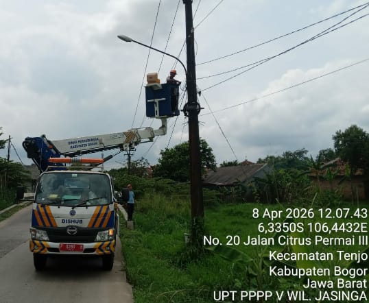 BOGOR – nusantarapublik.co.id ll Tim penerangan Jalan Umum (PJU) UPT PPPP V Wilayah Jasinga Kabupaten Bogor, melaksanakan kegiatan rutin pemeliharaan lampu PJU dan penerangan jalan orang. Titik penerangan telah selesai diperbaiki di lokasi pemeliharaan dan perbaikan di depan SMA.Negeri dan Jalan Citrus Permai lll Nomor 20 Kecamatan Tenjo di antaranya 2 (Dua) Desa Cilaku dan Babakan, Kecamatan Tenjo, Rabu (08/04/2026).